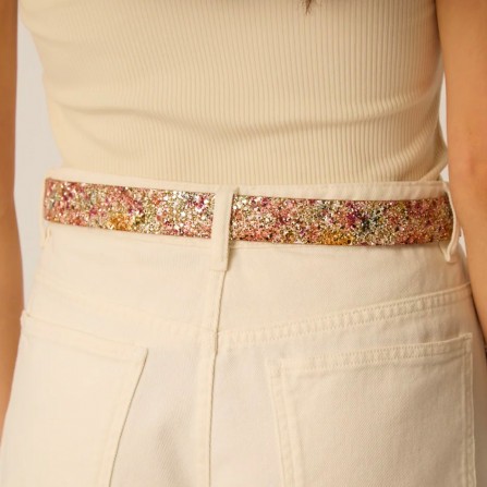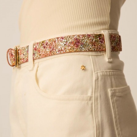 Accessoire parfait pour affirmer son style, la ceinture fine Omalice sort son épingle du jeu avec son motif floral et sa finition pailletée. Portée aux hanches sur un pantalon ou une robe, elle agira comme un attrape-regard.
