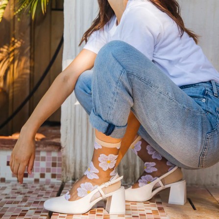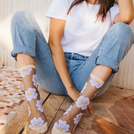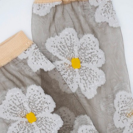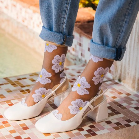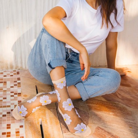 Féminine et délicate, cette paire de chaussettes s'inspire des fleurs de la ville de Murano, près de Venise. Le modèle crème tout en transparence dévoile de belles fleurs élégantes. À porter avec un jean bleu ou beige, une jupe longue et des baskets, des escarpins ou des mocassins.