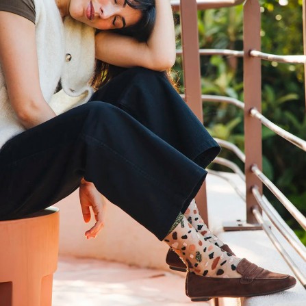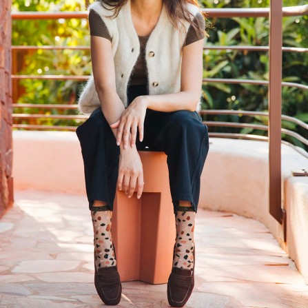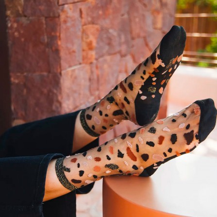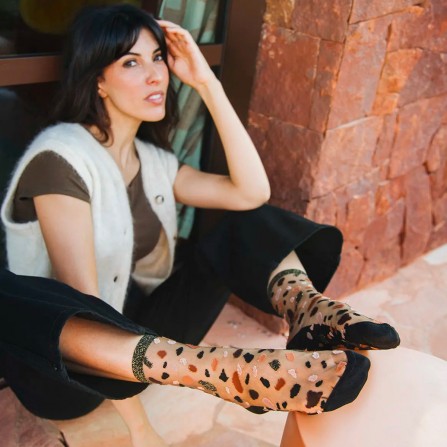 L'une des trois paires réalisées en collaboration avec Reqins. Le modèle brun s'inspire du givre sur un lac en hiver. Ce modèle rehaussera vos tenues avec style. Il est à porter avec un pantalon noir ou un jean brut ou clair. On peut également le porter avec des baskets, des escarpins ou des mocassins.