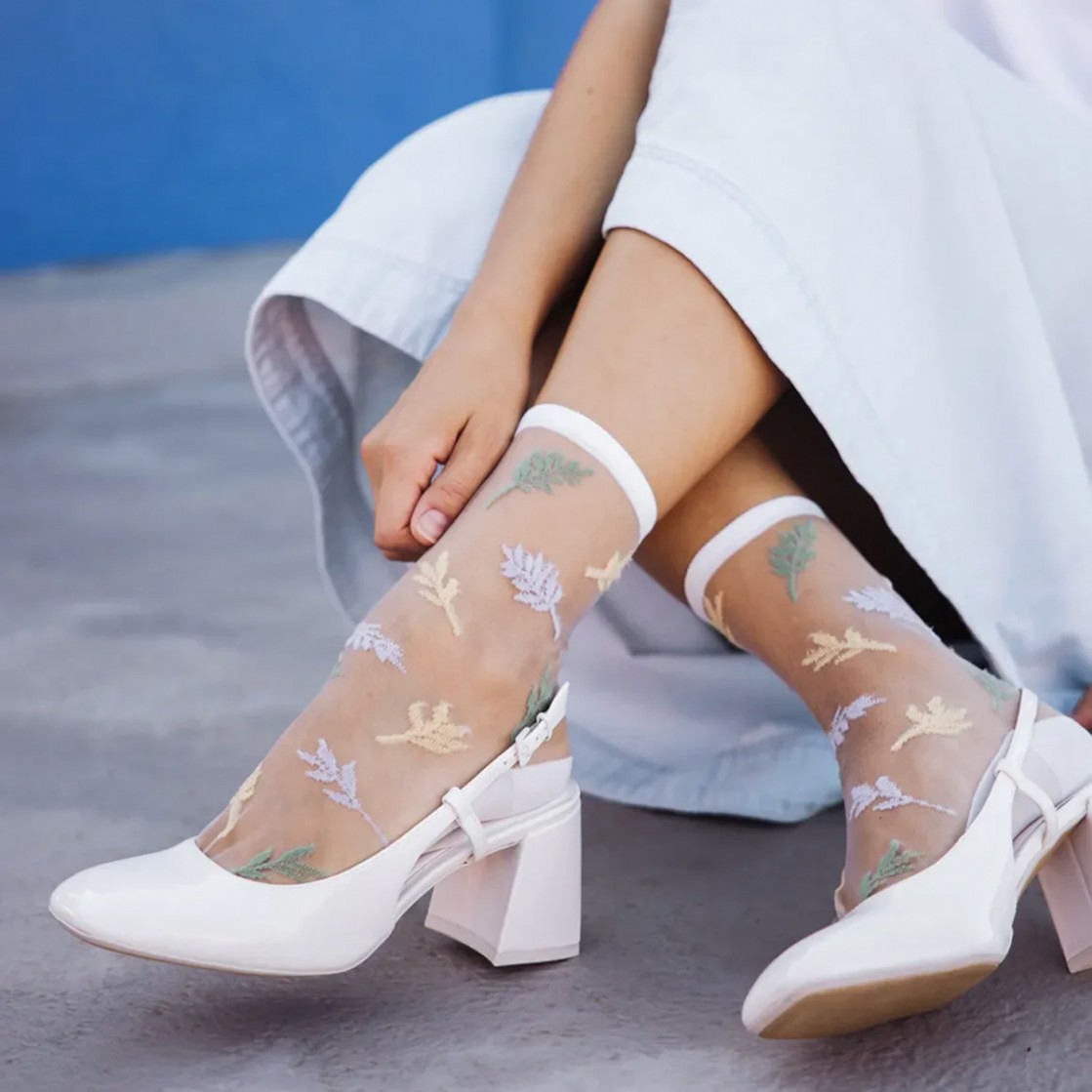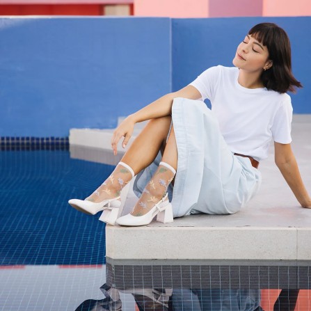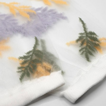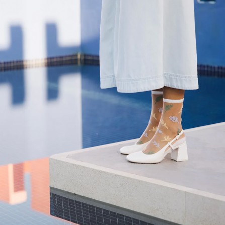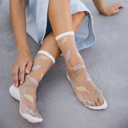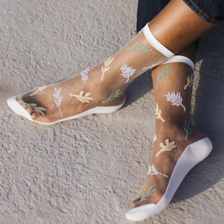 Découvrez la délicate Les Alpes Pastel. Ce modèle de chaussettes transparentes original et plein de douceur est une retranscription poétique des motifs de la chaîne Alpine, créant des formes semblables à des petites feuilles. Une chaussette à motifs mauves, jaune clair et vert pastel qui épouse votre cheville en toute finesse. Elle se portera à merveille avec des chaussures blanches et une robe ou un pantalon de couleur claire.