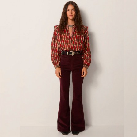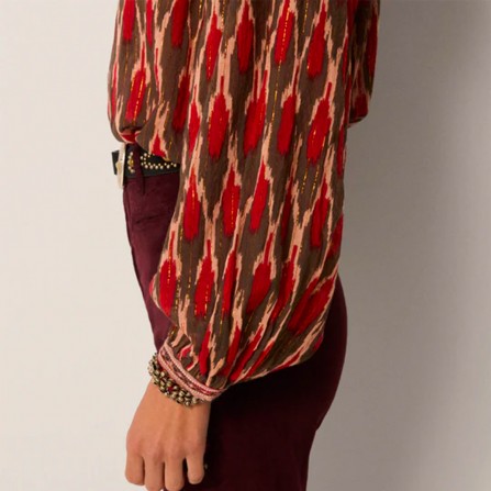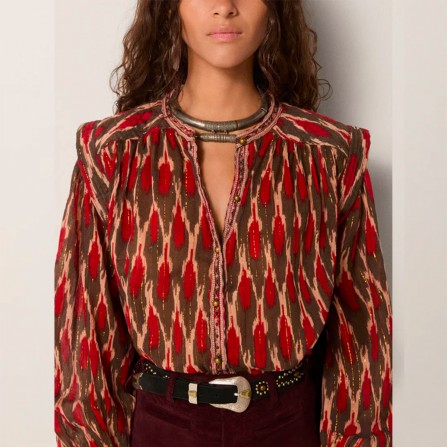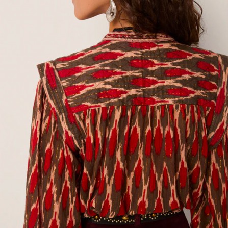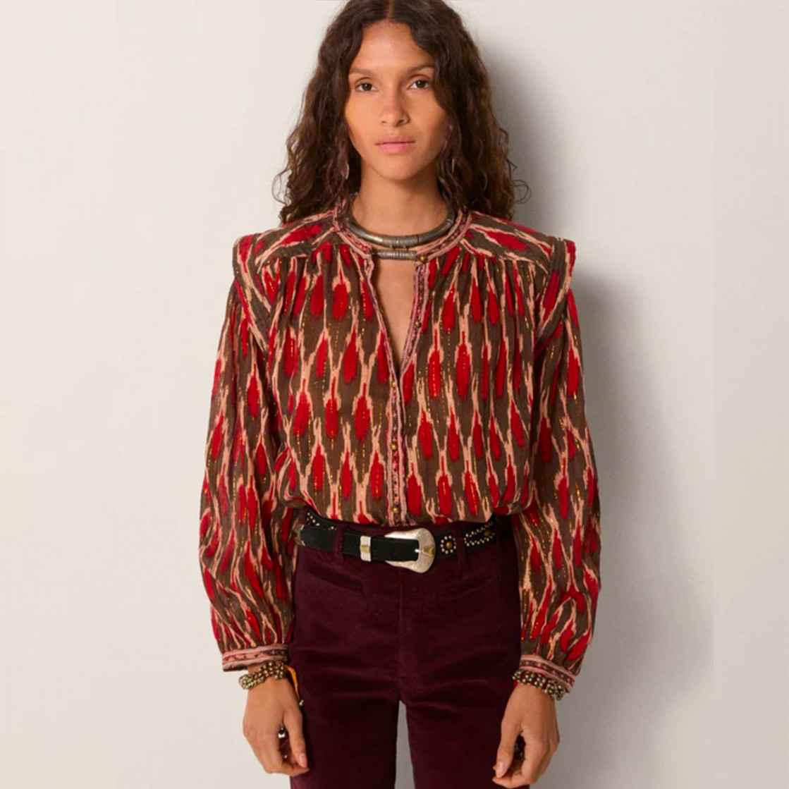Lurex de coton qui respire avec un léger éclat, rappelant la lumière capturée sur l'eau la nuit. La broderie tracée autour du cou et l'encadrement des boutons avant lui donnent une structure contre l'ombre sombre - teintée de chaleur, ancrée dans la terre.