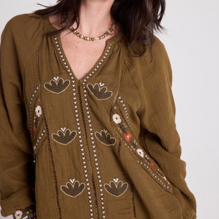 Elle est brodée de fleurs stylisées. Sa coupe ample assure le confort.