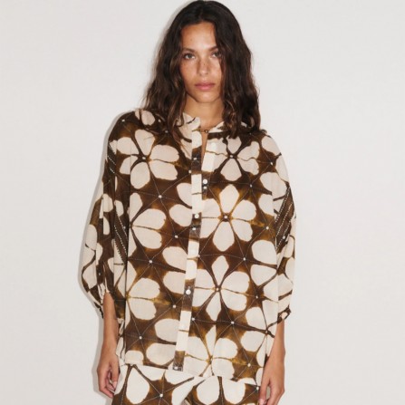 Cette blouse en voile de coton évoque la légèreté et le mouvement, comme un souffle d’air au fil de la journée. Ses manches chauve-souris, son col mao et la bande graphique placée lui donnent caractère et modernité, tandis que les boutons en nacre apportent une touche raffinée. Son volume généreux laisse libre cours à votre style, pour un look fluide et décontracté.
