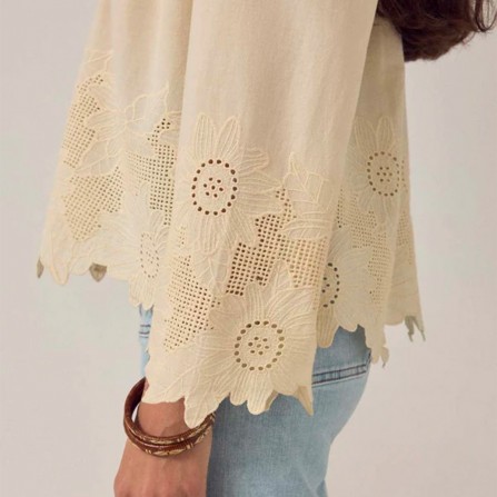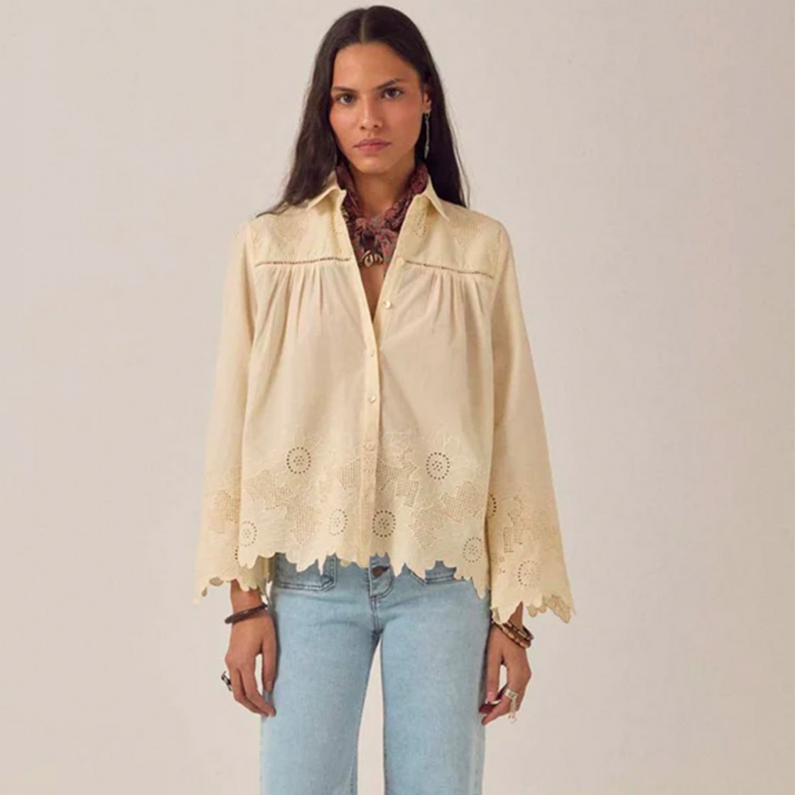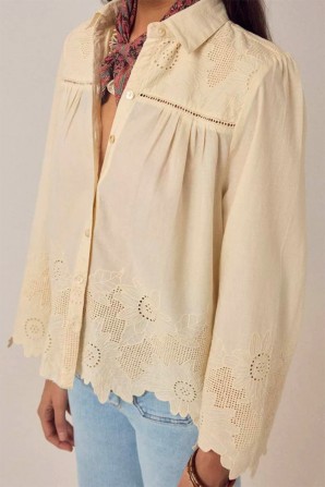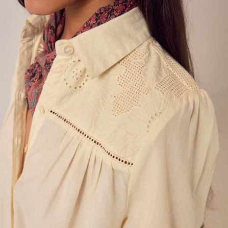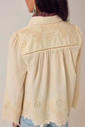 Chemisier boutonné en coton ivoire doux, orné de broderie anglaise. Col classique avec broderie anglaise à l'empiècement, manches longues à poignets festonnés à œillets, ourlet festonné orné de motifs de marguerites. Boutonnage sur toute la longueur. Décolleté en V parfaitement ajusté.