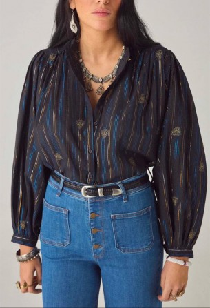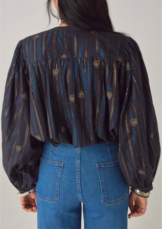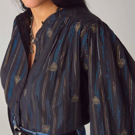 Blouse courte en coton rayé lurex. Col rond avec patte de boutonnage. Manches longues bouffantes à volume spectaculaire et poignets boutonnés. Fronces aux épaules et à l'encolure. Coupe ample et carrée arrivant au-dessus de la taille.