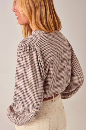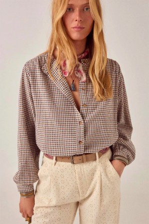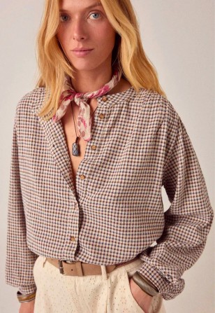 Le motif à carreaux est petit et traditionnel – un esprit couverture de pique-nique revisité pour plus de confort. Le tissu offre un joli drapé grâce à la viscose. À porter rentrée dans un pantalon taille haute