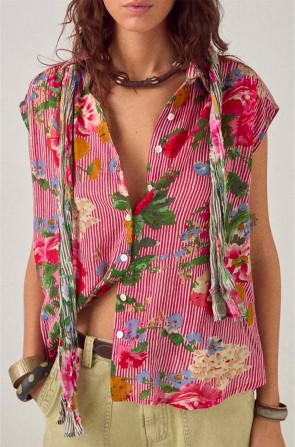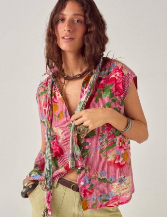 L'imprimé Bolton Soul se révèle ici dans sa forme la plus directe. Sans manches, le motif épouse les formes du corps, mettant en valeur la couleur et les proportions. Les fleurs, plus fournies et plus intenses, se détachent sur un fond rouge à fines rayures qui structure et rythme la silhouette.
