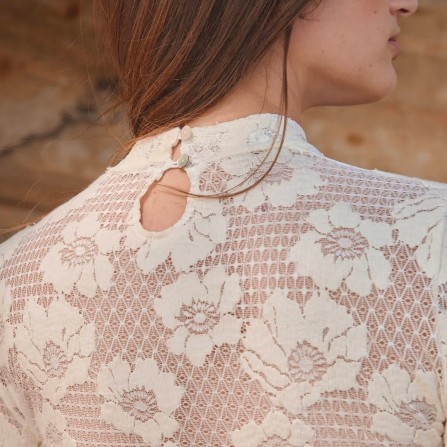 Boutons en nacre dans le dos du col avec une ouverture en forme de goutte