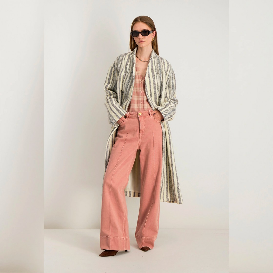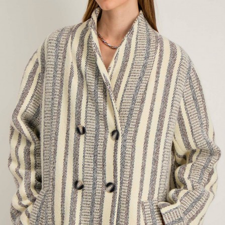 Réalisé en lainage jacquard italien, le manteau Felie séduit par sa coupe croisée et sa doublure rayée, et incarne un style raffiné.