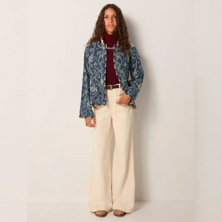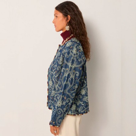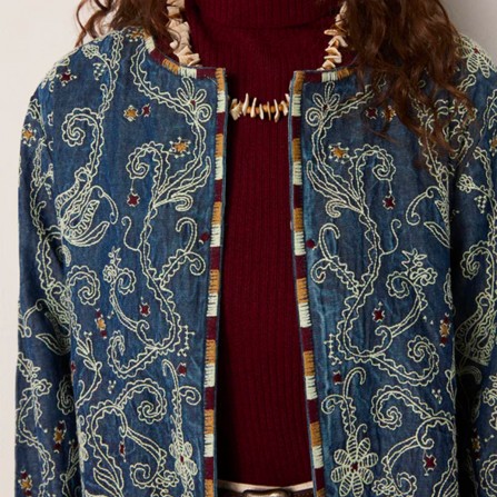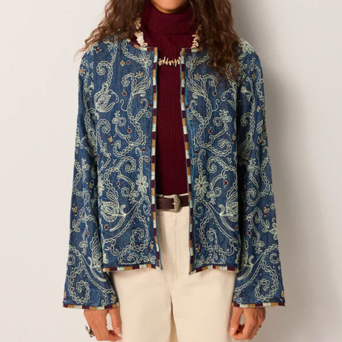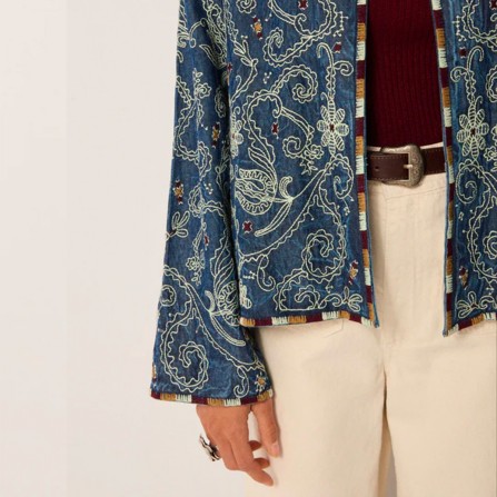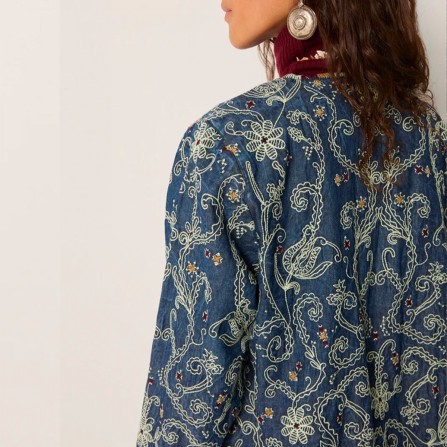 Sa surface est entièrement brodée de motifs paisley sinueux en fil d'ivoire doux, superposés comme un motif continu sur le corps et les manches. De subtiles bordures à carreaux encadrent les bords, monant les coutures ornées avec une précision sur mesure.