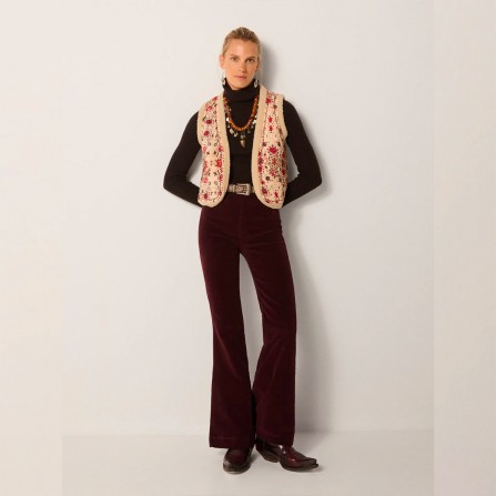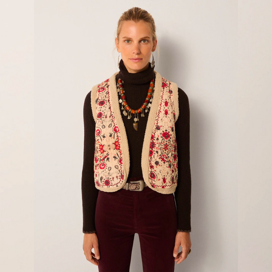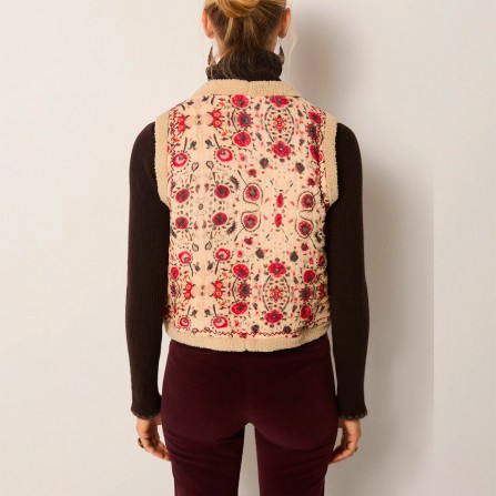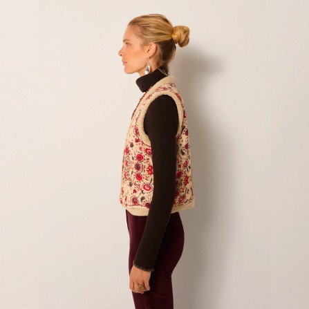 Dobby en coton matelassé, à motifs de rouges en fleurs et de motifs terreux sur un sol pâle, doublé de shearling doux pour la chaleur. L'impression est vintage et folklorique, une tapisserie adoucie par le temps.