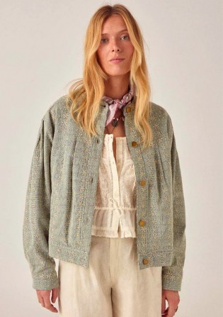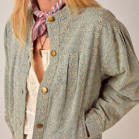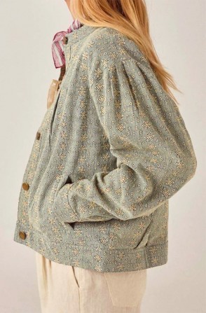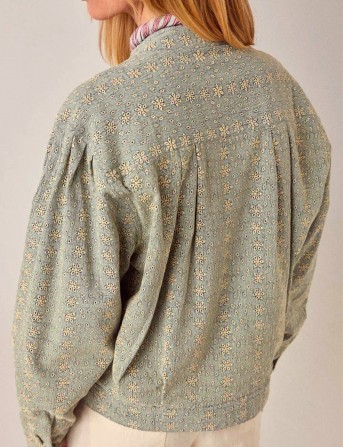 Veste courte en sergé de coton brodé. Col rond, fermeture boutonnée sur le devant avec cinq boutons métalliques. Manches longues froncées aux épaules et poignets boutonnés. Poches latérales. Coupe ample et carrée arrivant aux hanches. Même motif ajouré brodé que le pantalon Theodore et le gilet Florence : de petites perforations florales et géométriques sur le tissu.