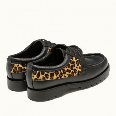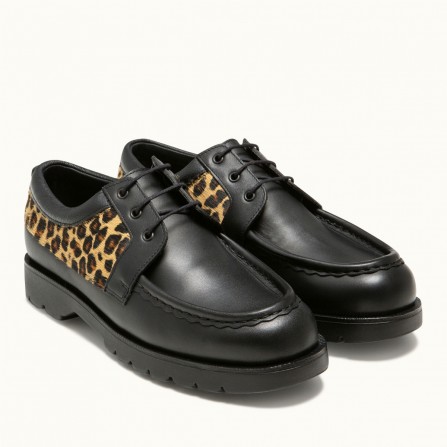 Ce derby hybride, inspiré des chaussures bateau, mêle l’élégance brute du workwear à une touche audacieuse avec son imprimé léopard. Sa semelle crantée robuste reflète la fonctionnalité et l'authenticité emblématiques de KLEMAN.