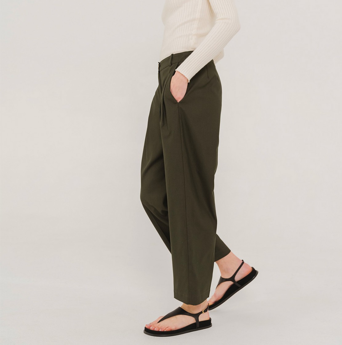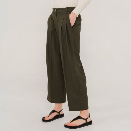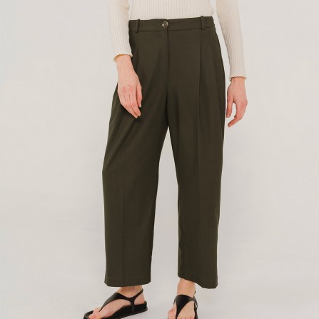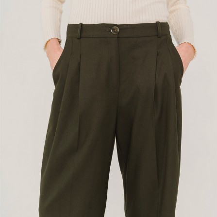 PEPA est un pantalon 7/8ème, taille medium, volume loose avec ces deux pinces devant, jambe un peu large se resserrant doucement sur le bas.
