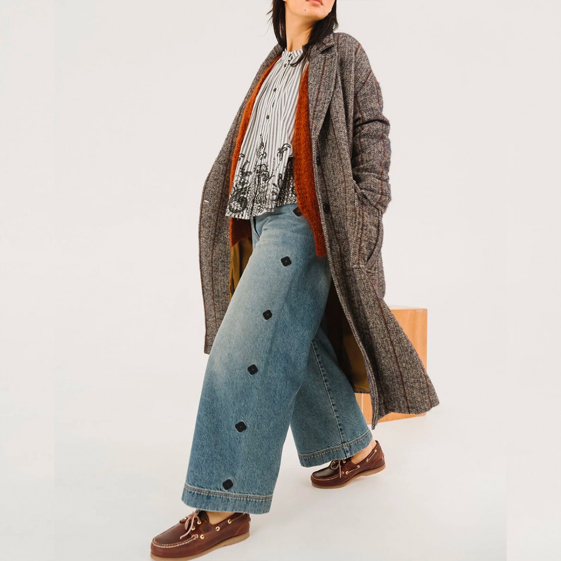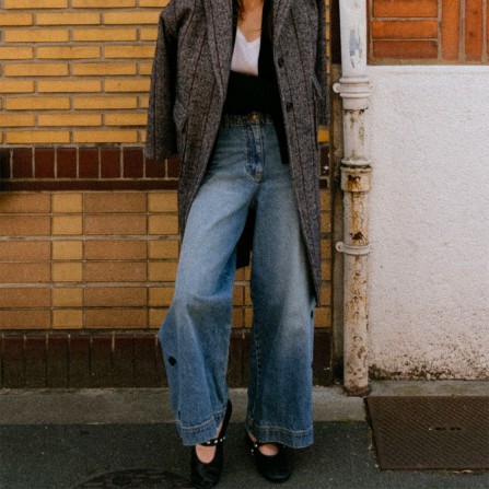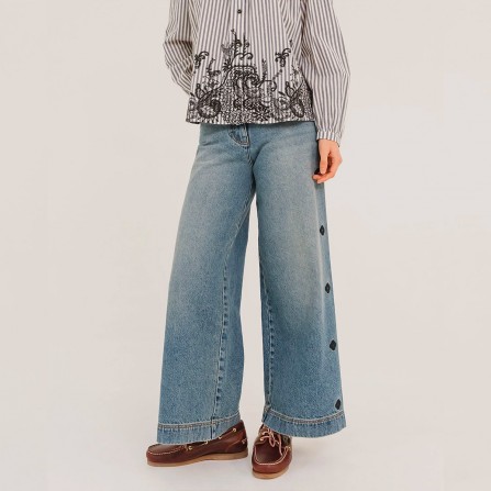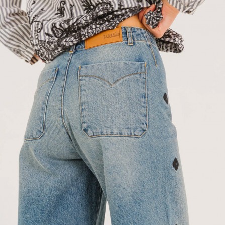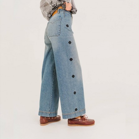 XULU est coupé dans un denim indigo authentique. Détails de broderies aux côtés.