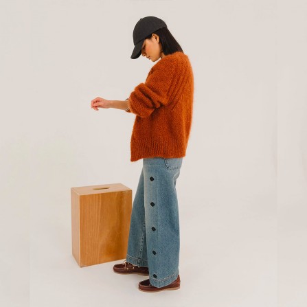 XULU est un pantalon 7/8ème, taille haute, emboitant les hanches, jambes larges et droites, sans coutures aux côtés.