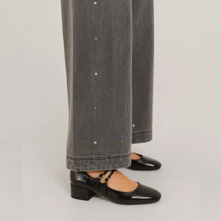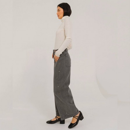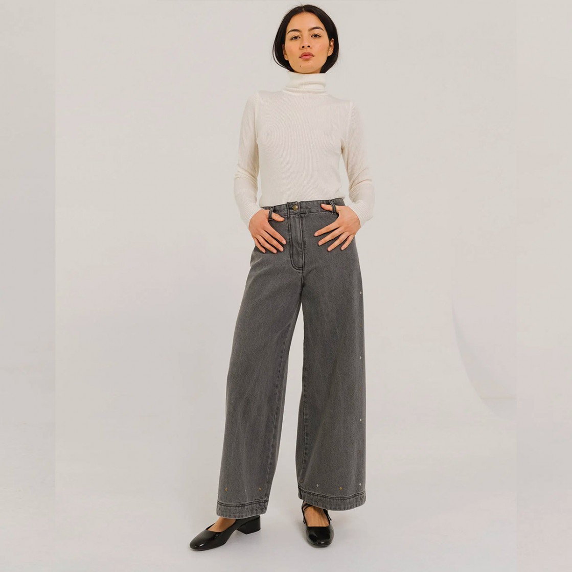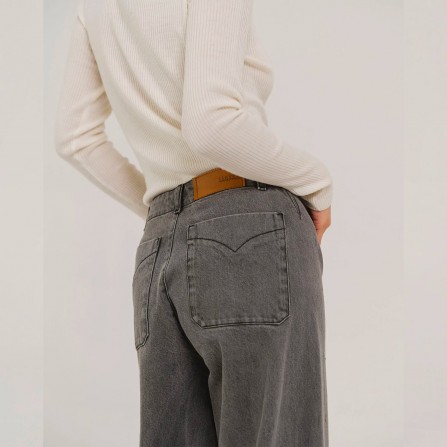 XULU est coupé dans un denim gris authentique. Détails d’application de rivets aux côtés et sur le bas devant.