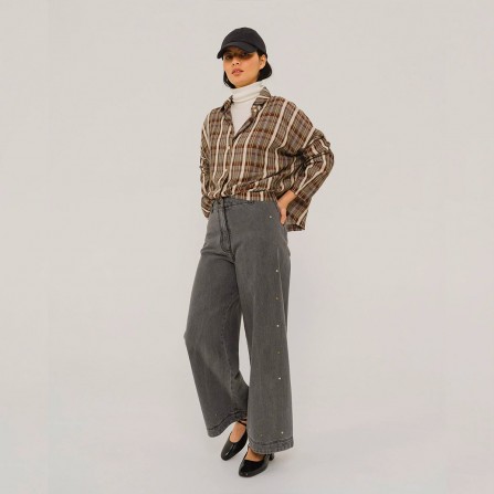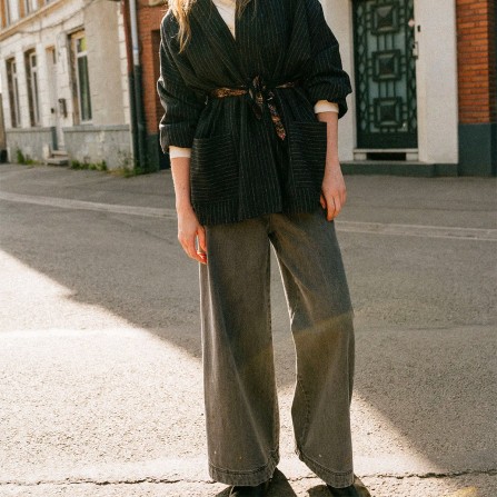 XULU est un pantalon 7/8ème, taille haute, emboitant les hanches, jambes larges et droites, sans coutures aux côtés.