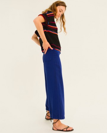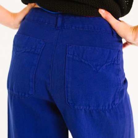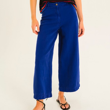 XULU est un pantalon 7/8ème, taille haute, emboitant les hanches, jambes larges et droites, sans coutures aux côtés.