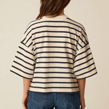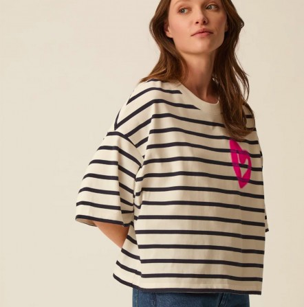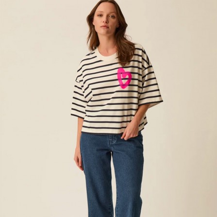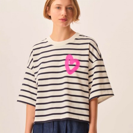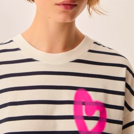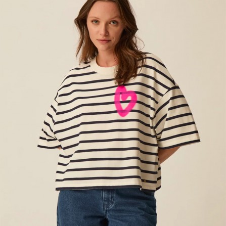 Le t-shirt Fionna casse les codes de la marinière classique en adoptant une coupe oversize boxy très actuelle. Décliné en jersey de coton épais, l'imprimé coeur effet tag apporte une touche urbaine à ce basique revisité.