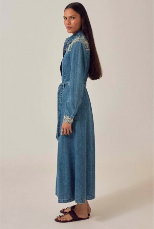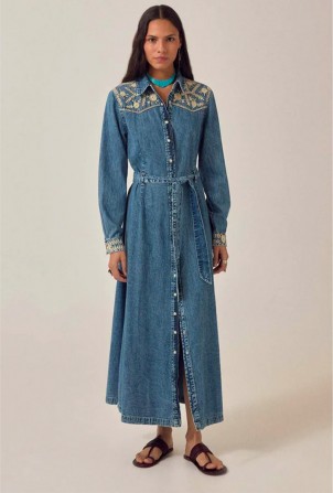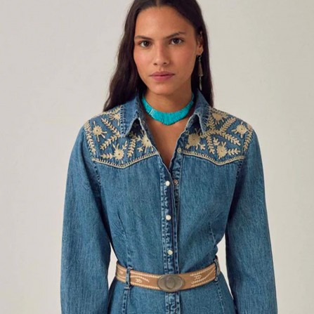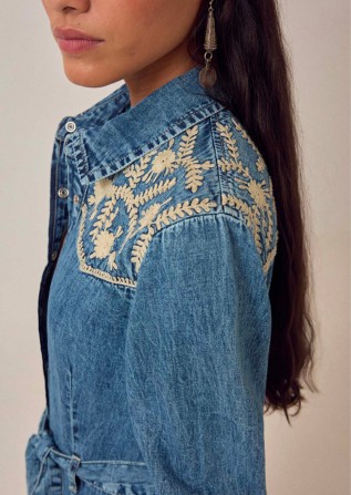 Broderie ivoire à l'empiècement et aux poignets. Un détail subtil qui met en valeur le denim sans le masquer. Le tissu est léger, fluide, plus proche d'un chambray patiné que d'un denim rigide.