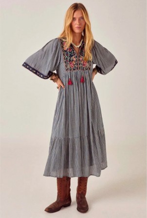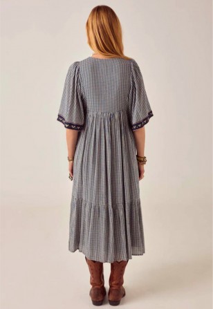 Manches papillon larges bordées d'un chevron brodé. Le corsage, froncé à partir d'une couture empire, se prolonge en une jupe ample à volants, d'une belle fluidité – ni trop rigide, ni trop légère. Sa longueur midi est idéale avec des bottines plates ou pieds nus sur une pierre chaude.
