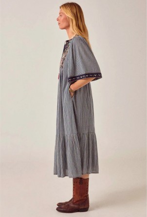 Une robe en micro-vichy bleu marine et ivoire d'une qualité exceptionnelle. L'empiècement est richement brodé de motifs floraux à la main dans des tons rose poudré, vert forêt et ocre – un travail minutieux qui demande des jours, et non des heures. Deux pompons rouges ornent la poitrine, tels une discrète ponctuation.