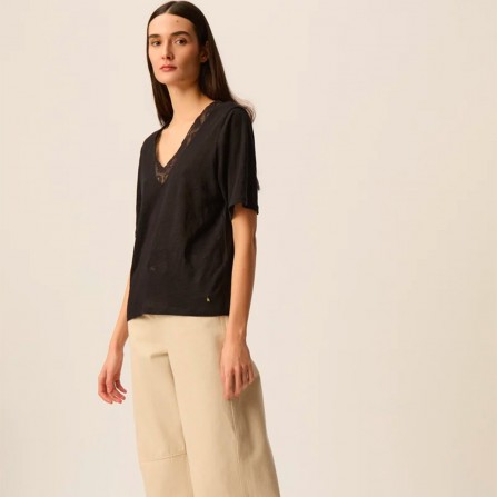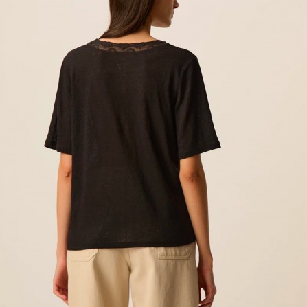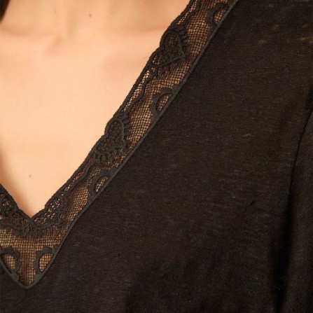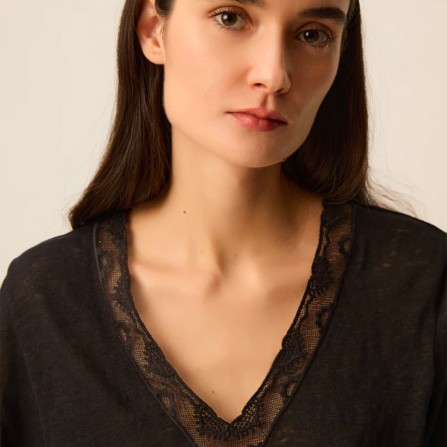 Le t-shirt col V en lin Hela gagne en féminité avec son encolure sertie d'un empiècement en dentelle exclusive. Modèle élégant et léger à porter avec un jean ou une jupe, il apportera une touche lingerie à vos looks dès le printemps.