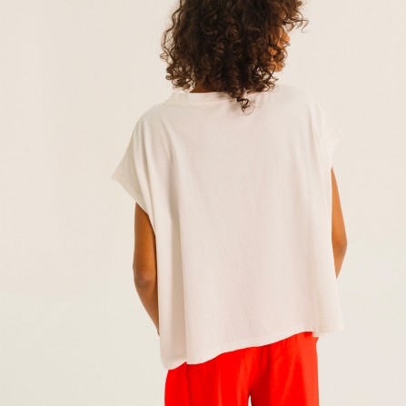 T-shirt à encolure ronde, manches courtes, coupe “boxy” droite et loose.